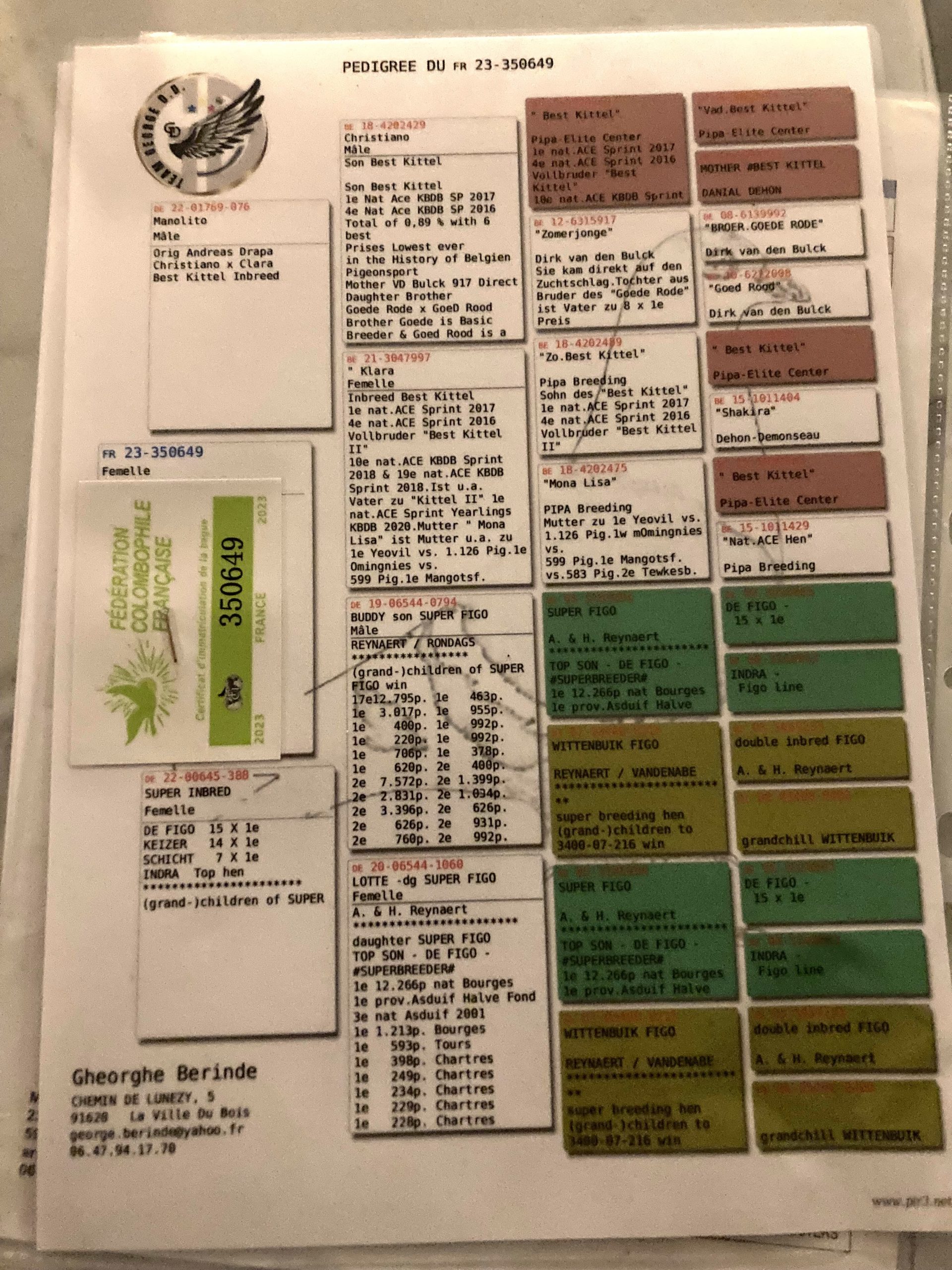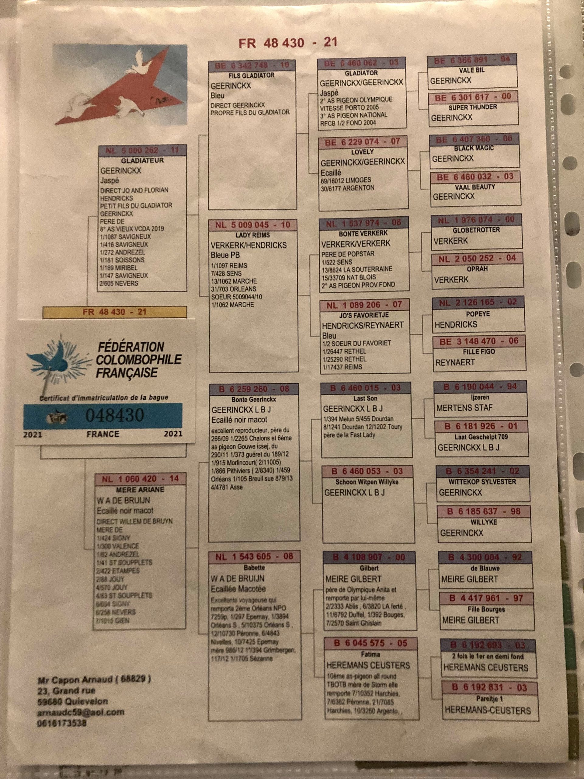 Cinquième du critérium national pigeonneaux 2025 de la FCF, Sébastien Pedroni (Coubron, Amicale colombophile de Marne la Vallée) offre un pigeonneau à prendre en mars avril. On ne devient pas champion sans bon sang. Sébastien Pedroni nous fournit les pedigrees des parents : le meilleur de Pipa Elite center avec l’extraordinaire Figo Reynaert et les Geerinckx. Un investissement sûr pour les 200-600 km !