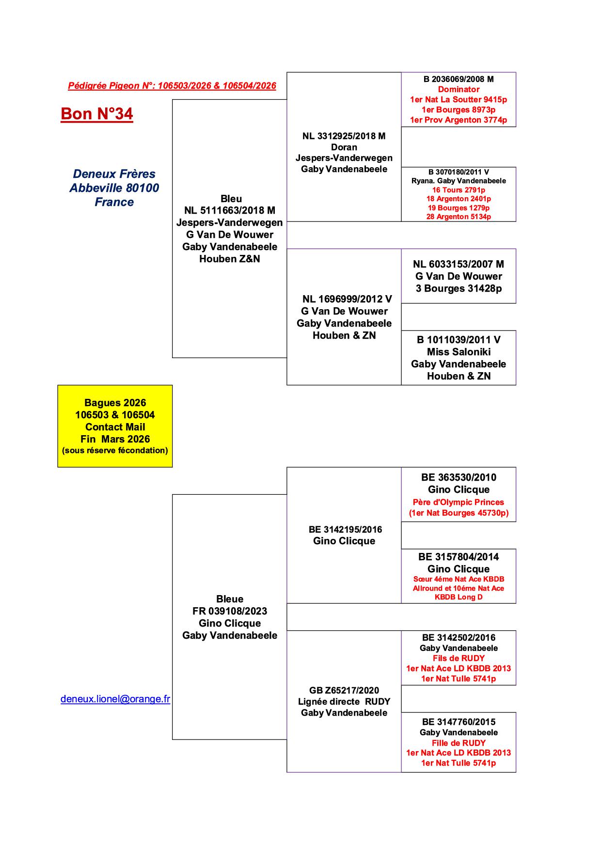 Offre 2 pigeonneaux (Contact fin Mars) Voir pédigrée joint (descendance Jespers.Vanderwegen/ G Van de Wouwer x G Clicque /Vandenabeele)