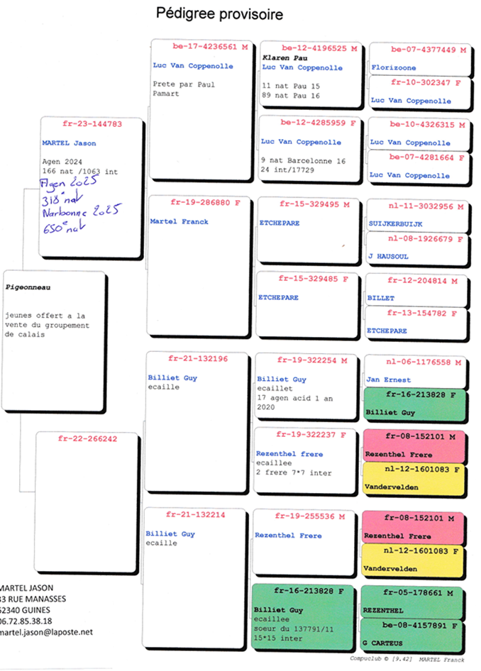 Jeune sociétaire de l’Hirondelle de Guînes offre un pigeonneau prendre contact à l’issue de la vente (voir pédigrée ci-dessous)