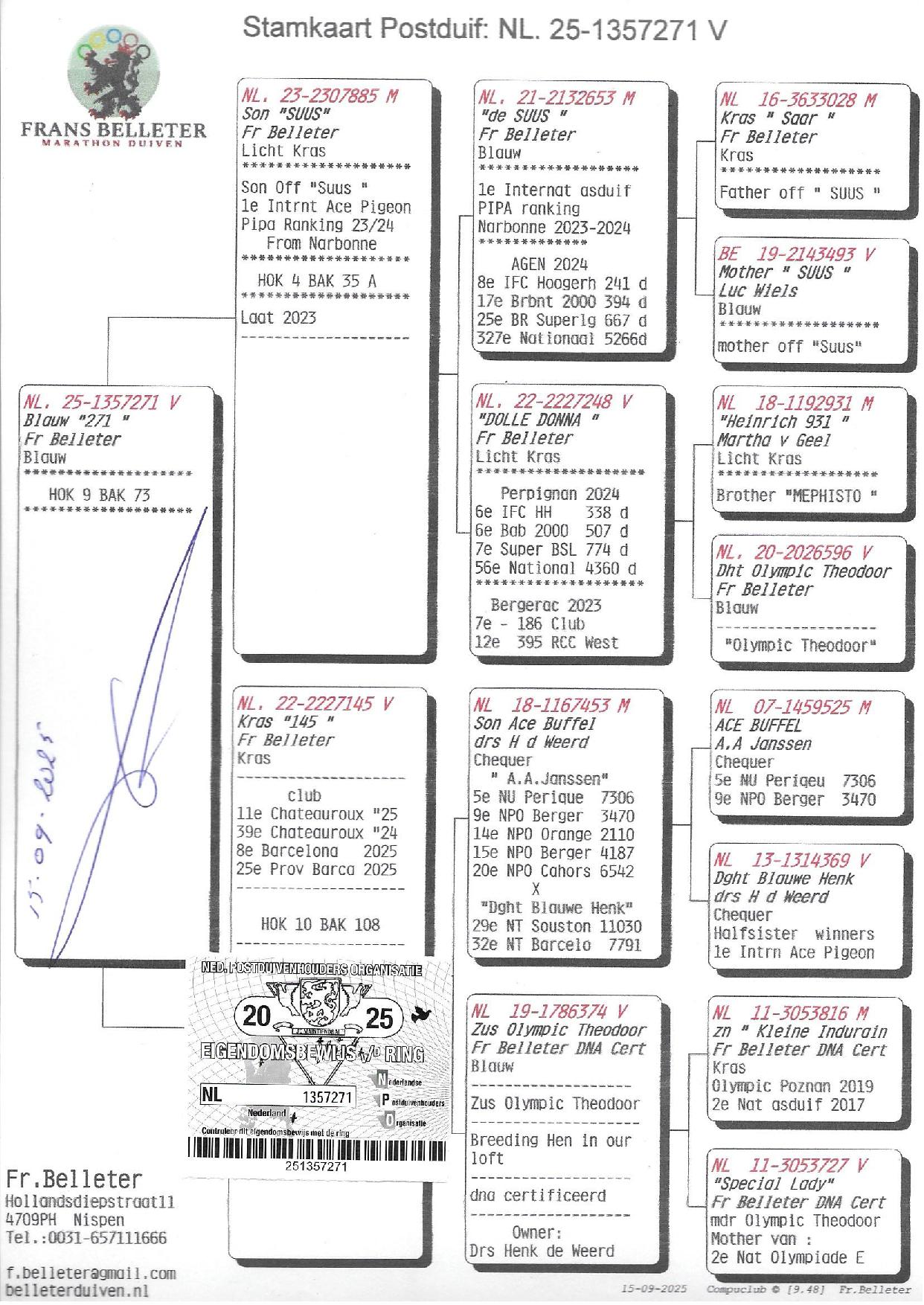 Le crack SUUS a été accouplé à la DOLLE DONA de 2022, femelle extra voyageuse VAN GEEL x
