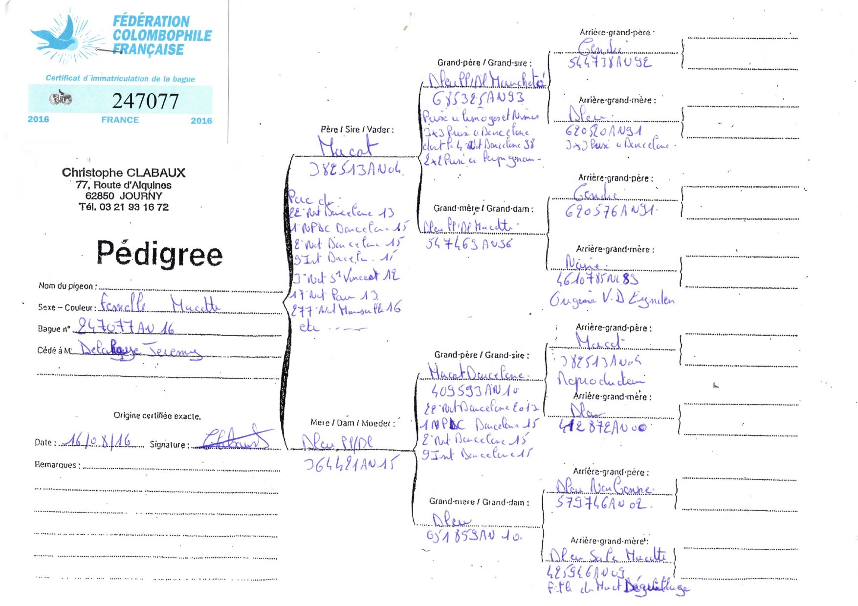 Femelle Bleue Macottée 247077-2016 Une Christophe CLABAUX Consanguine du Macot Barcelone (Grand père x petite fille) mais surtout ½ sœur du 2ème Nat Barcelone 2015 et du 3ème Nat St Vincent 2012