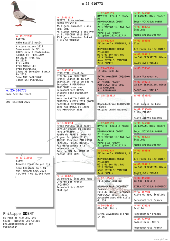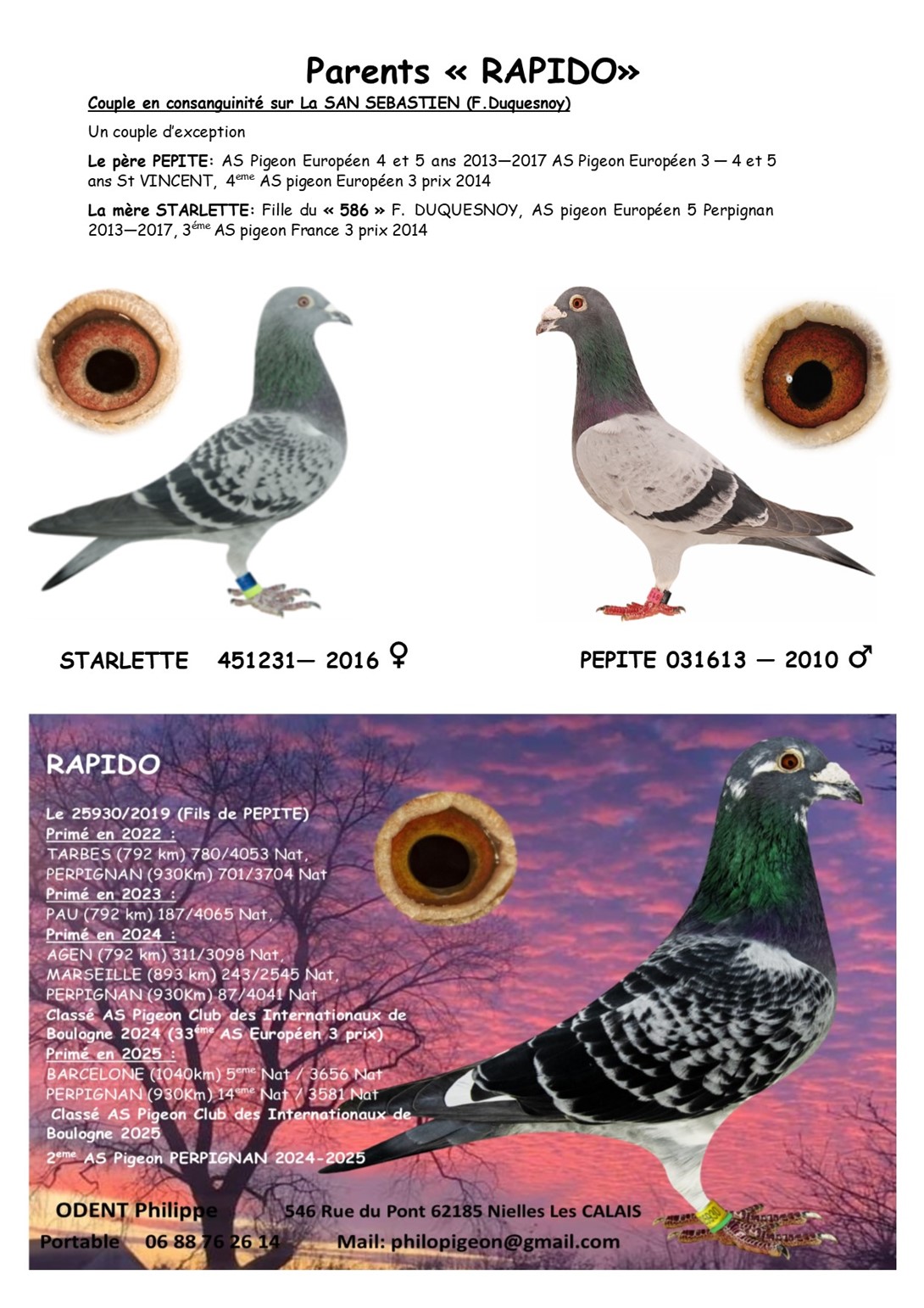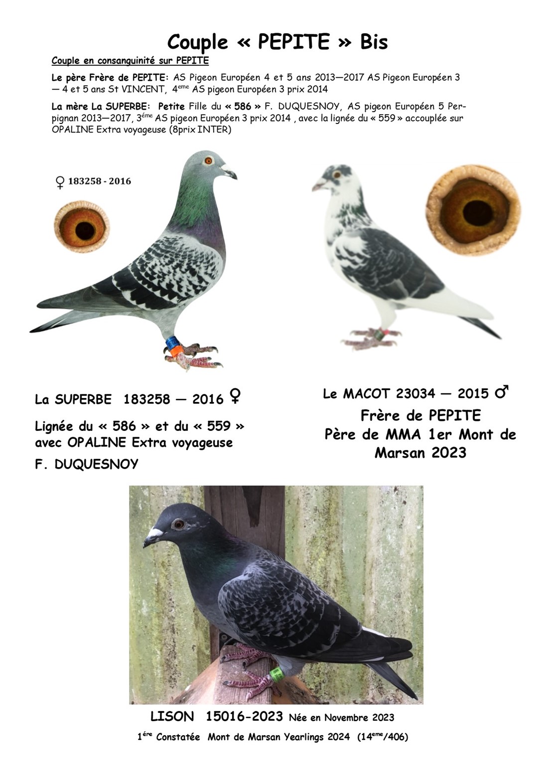 C’est un accouplement basé sur deux AS Pigeon Européen PEPITE (St VINCENT (5) et PAU (5)) et le 586 de Franck DUQUESNOY (PERPIGNAN (5))