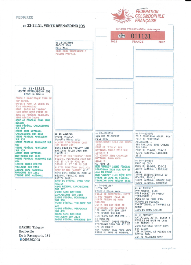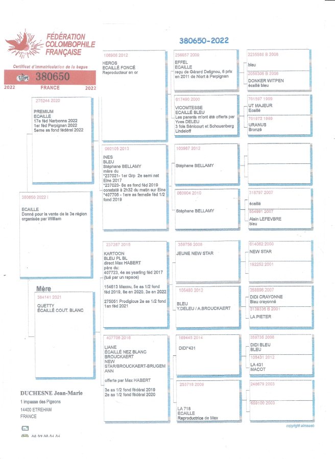 Le jeune a comme parents, femelle du colombier Thierry Bazire, le mâle du colombier Jean Marie Duchesne