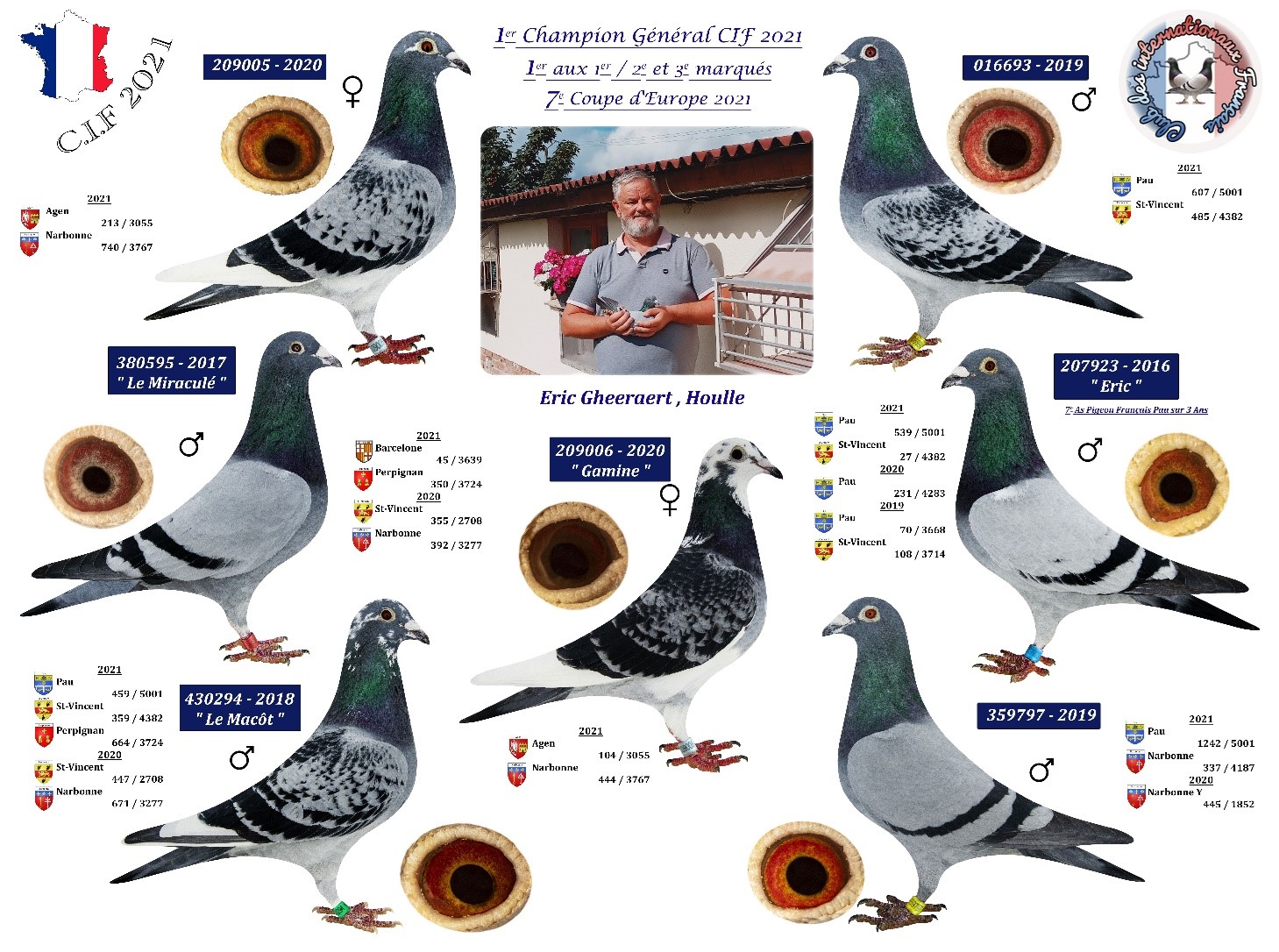 Éric se classe 7e à la coupe d’Europe en 2021 et 12e AS pigeon Européen sur BARCELONE 2021-2022-2023. Éric réalise chaque année un pourcentage de prix aux internationaux de 55% sur les trois dernières années.