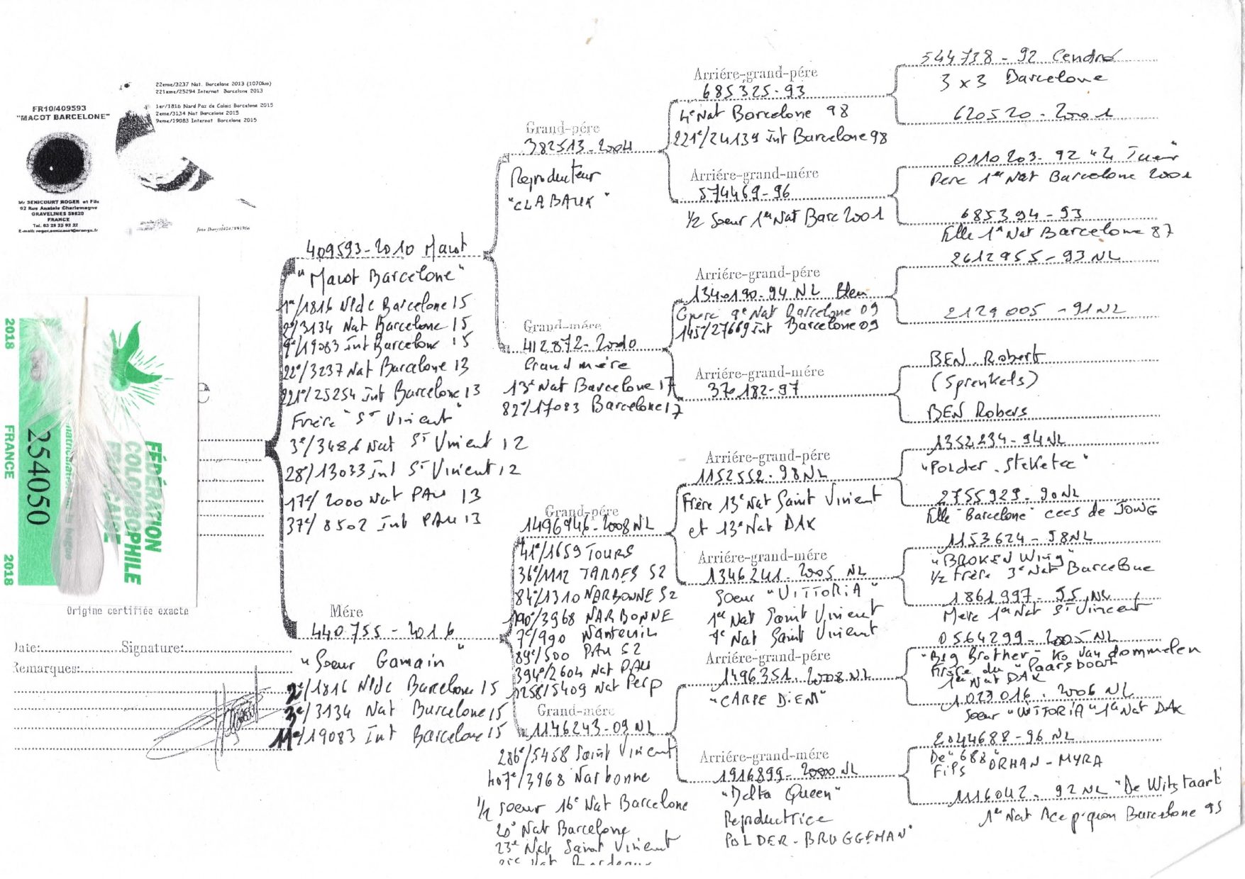 Femelle macottée 254050-2018 Une Roger SENICOURT fille du Macot Barcelone 2ème Barcelone Nat 2015 et frère du 3ème St Vincent 2012. Fille de la sœur du GAMIN 3ème Nat Barcelone Nat 2015. Un concentré des meilleures origines Néerlandaises Sprenkels Steketee Ko Van dommelen