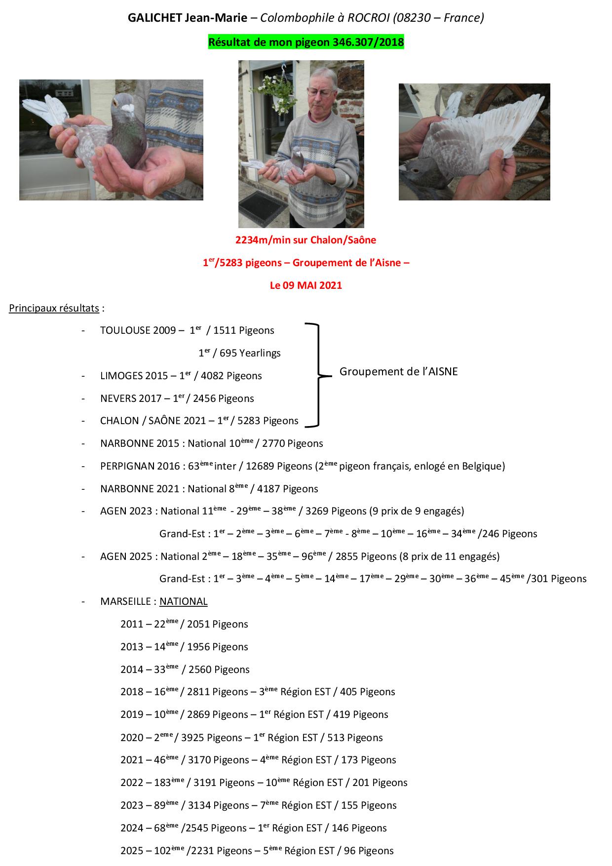 - 2020 : 2ème / 3925 Pigeons – 1er Région EST / 513 Pigeons