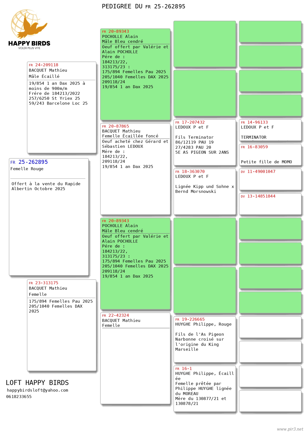 La mère de cette femelle réalise cette saison le doublé sur Pau et Dax. Elle à pour père le fameux reproducteur de chez Alain et Valérie POCHOLLE accouplé cette fois-ci sur les pigeons de Philippe HUYGHE. L’arrière-grand-mère maternelle est la mère du 130878 de 2021 qui réalise le 21e Nat Agen à l’âge de 18mois.