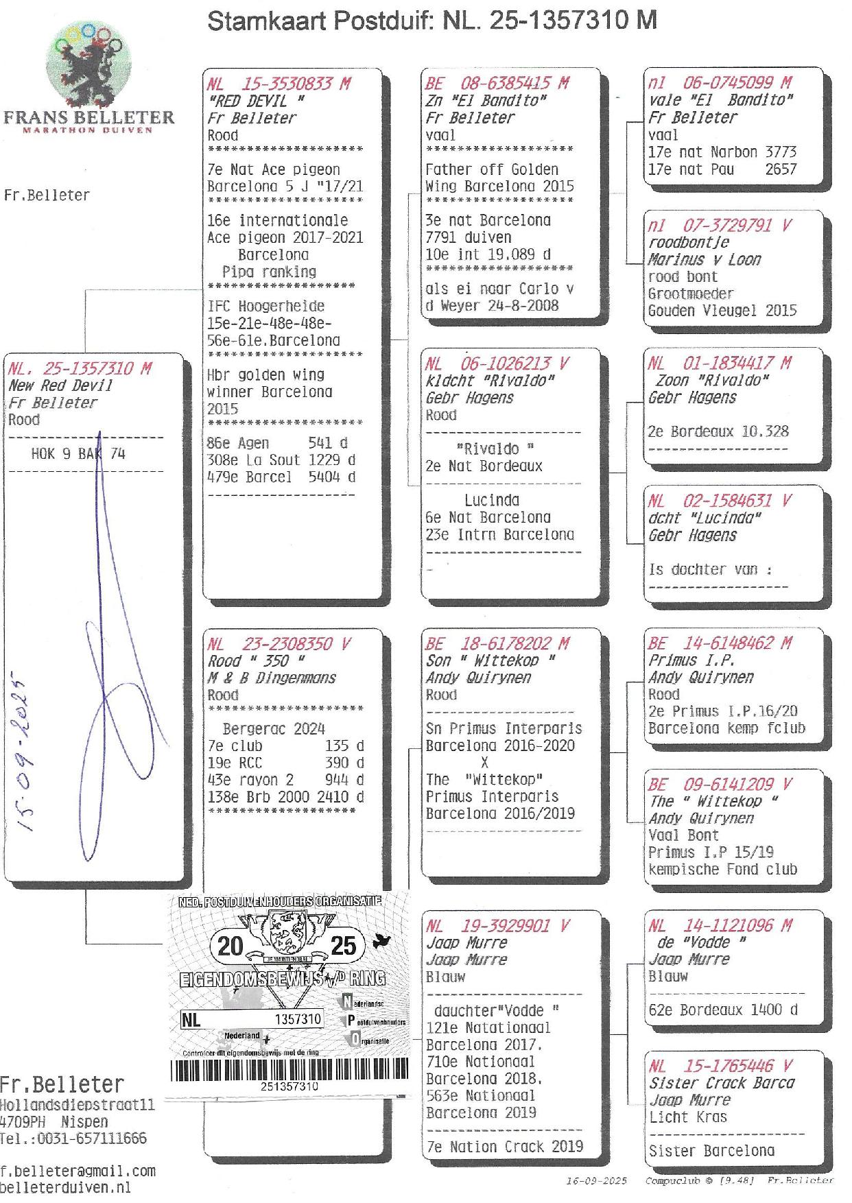 Il a remporté grâce à ses exploits le 7ème AS PIGEON NATIONAL HOLLANDE BARCELONE 5 ans (2017/2021).