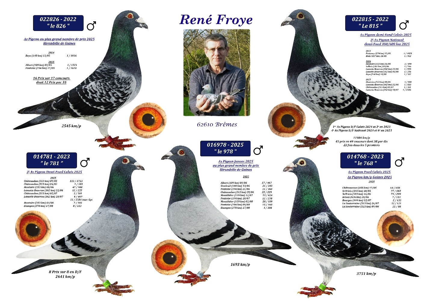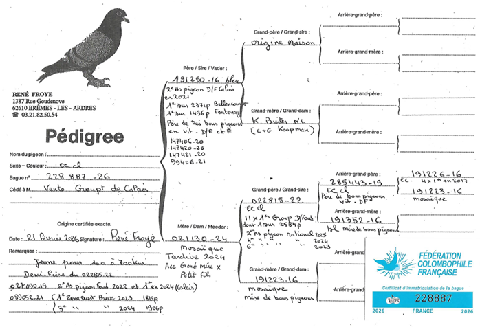 Vous trouverez dans ce DON le 815 / 2022 (voir Tableaux avec palmares de celui-ci) une fille du 815 accouplée avec le 250/2016 l’un des des ses anciens AS pigeon