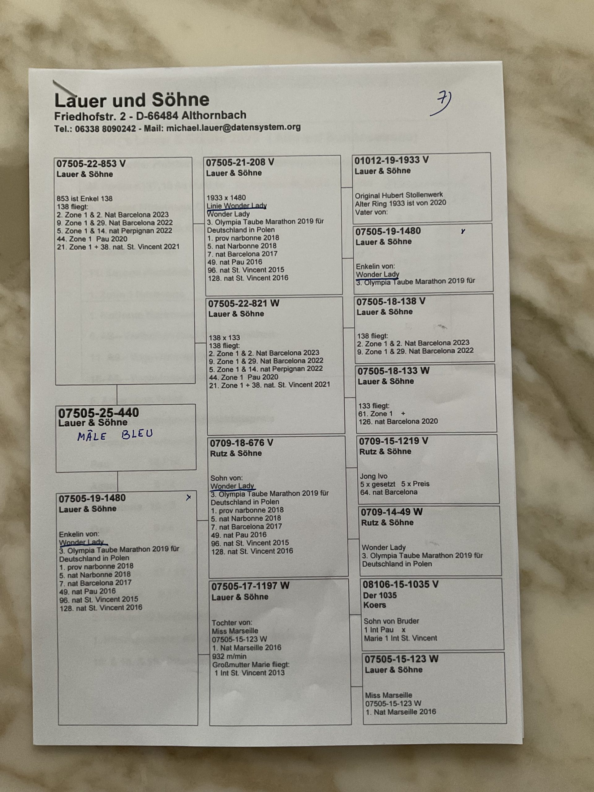 La famille LAUER nous met à disposition un jeune mâle issu de croisement entre les meilleures colonies allemandes :KOERS et RUTZ (pigeon olympique WONDER LADY)avec un peu de consanguinité sur cette WONDER LADY.