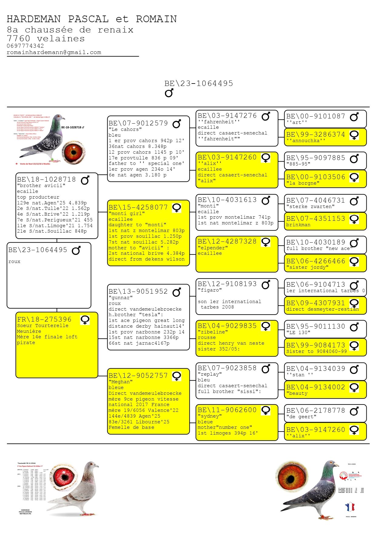 Lignée paternelle (pedigree) : un male belge provenant de PASCAL et ROMAIN HARDEMAN (Champion d’Europe 2022), dont le père provient de Mrs VANDEMEULEBROEKE, et est le frère de nid de Mikautadze (10e Ace pigeon Loft Pirate et 14e de la finale 2025)