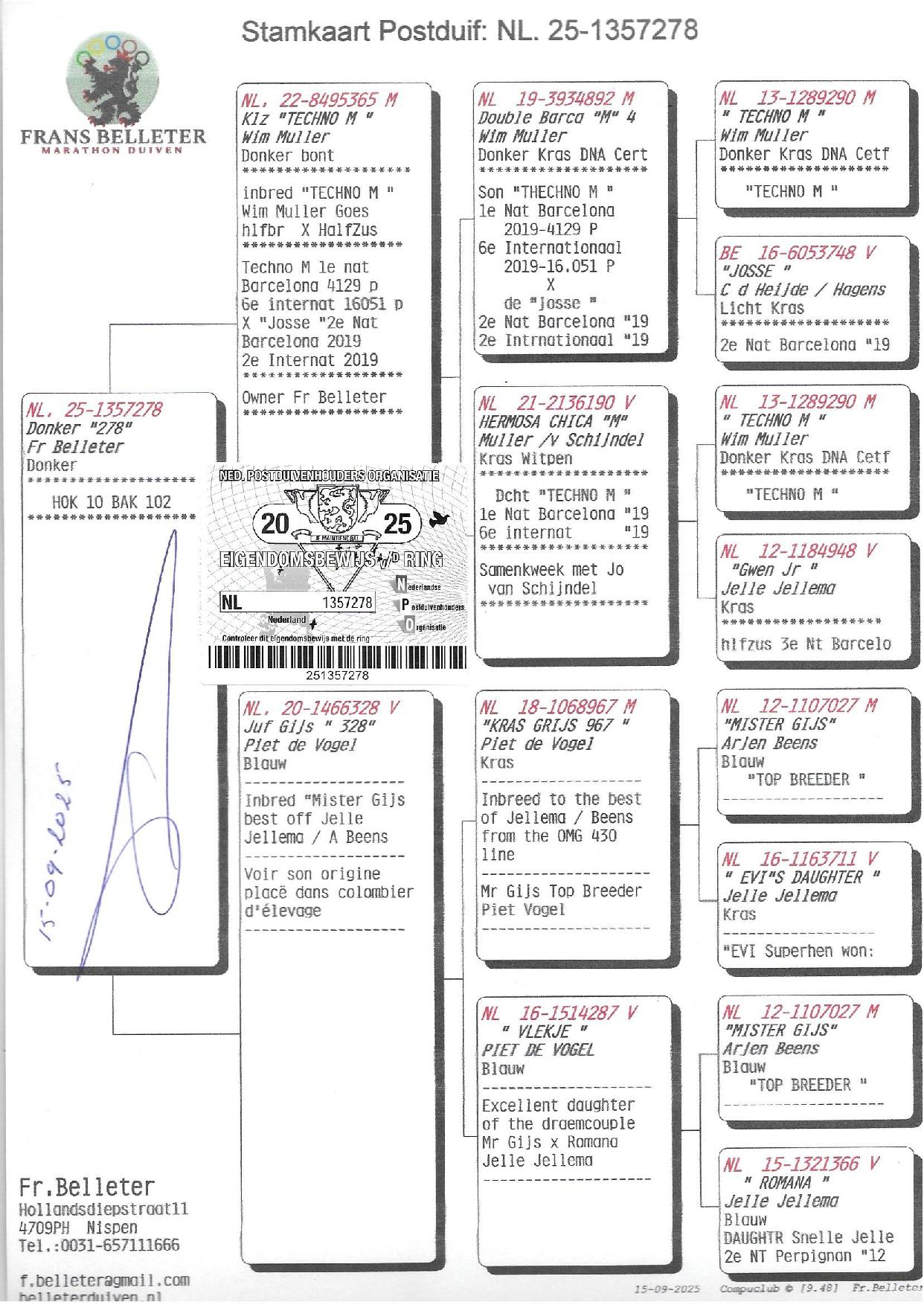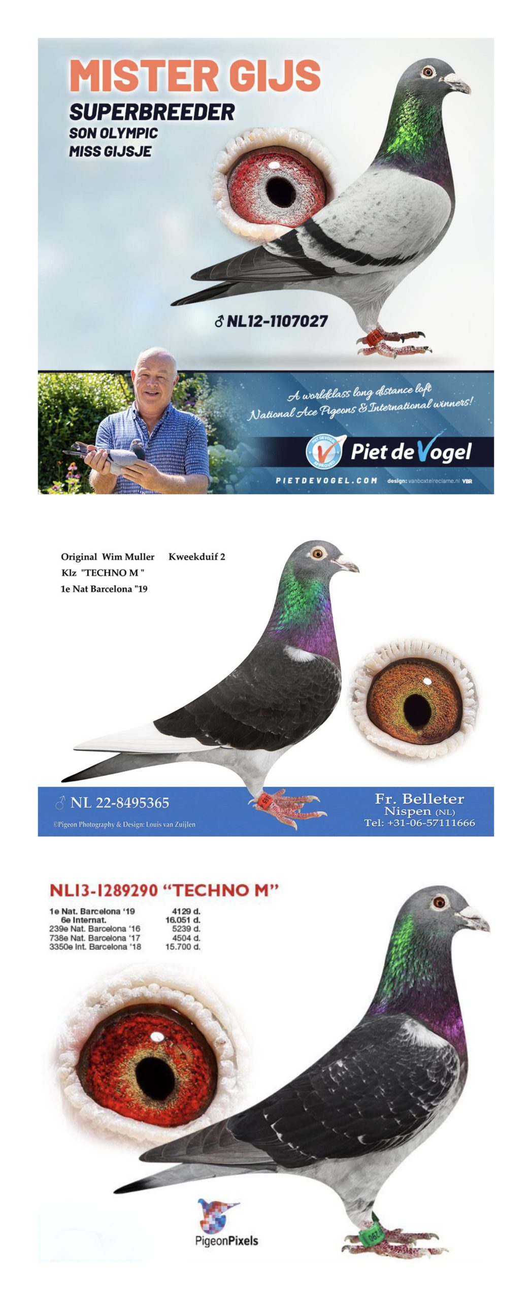 Nous sommes donc ici en face d’un lot hyper prometteur en termes d’élevage, mariant le top du colombier de WIM MULLER et la crème du loft de reproduction de PIET DE VOGEL via la top MISS GIJSE d’ARJAN BEENS.
