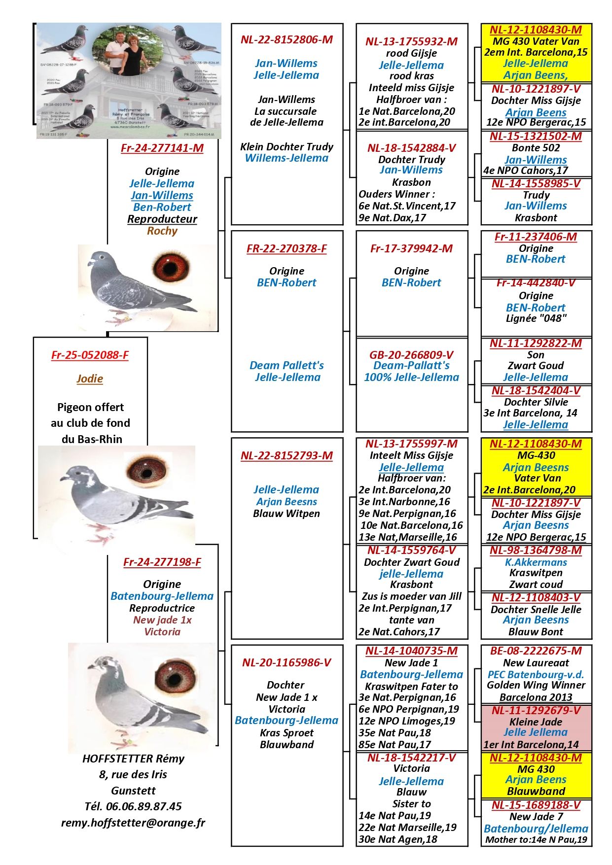 De la lignée MG 430 NL-12-11108430 de Jelle Jellema. Ce pigeon a produit de nombreuses progénitures réussies dont des gagnants de grandes courses comme la 1ère Nationale de Barcelone, la 3ème Internationale de Narbonne.