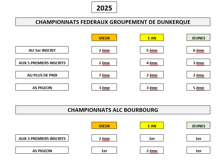 En 2025 il est en tête de nombreux concours et championnats dans toutes les catégories notamment au groupement de Dunkerque et au dépôt de l’ALC Bourbourg.