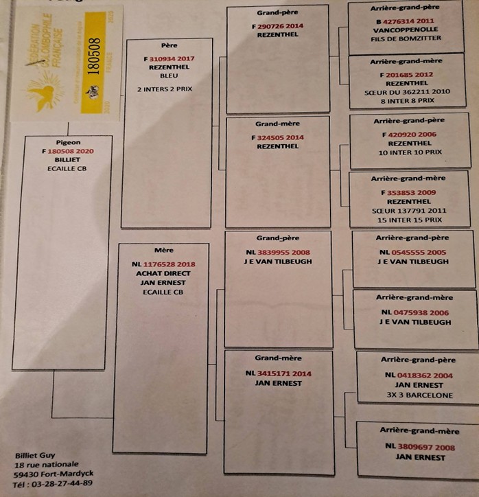 La mère du petit noir vient de chez Guy Billiet, qui avait peu de pigeons mais qui jouait très fort.. pour ceux qui ne le connaissent pas, vous pouvez consulter d’anciens résultats d inters, c’était du genre 5/5 à St Vincent, 5/5 à Perpignan.. dans le pedigree, on retrouve les frères Rezenthel avec lesquels il était en contact et on retrouve un jean Ernest par achat direct