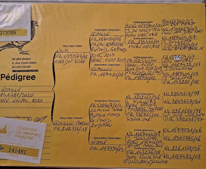Le pigeon offert( pigeon de 2025) le père vient directement de chez robert Ben ,on retrouve toutes ses anciennes lignées ,il y a un pigeon de 2016 dont le père vient direct de Jos de Smeyter avec pas mal de prix, des Jellema, des van der Velden, des Kurvers ….